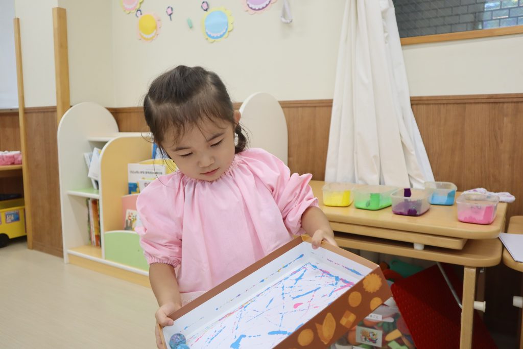 また、好きな色の絵の具を付けたビー玉を画用紙の上に転がして。。。