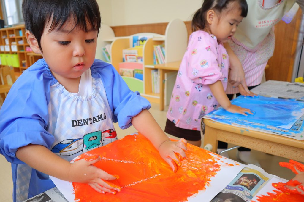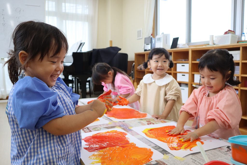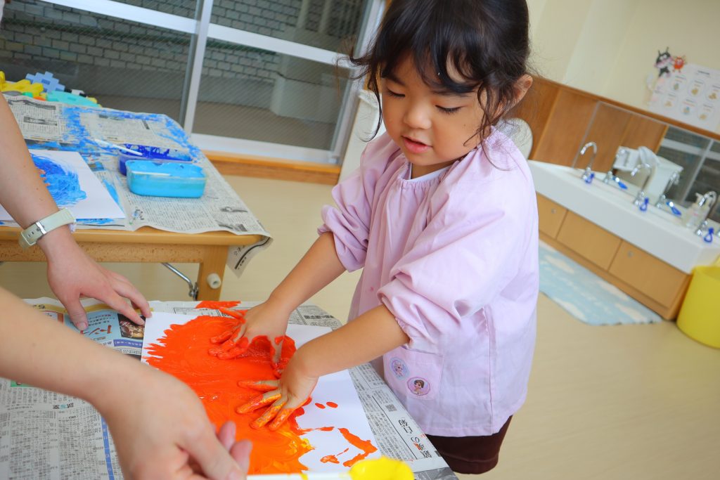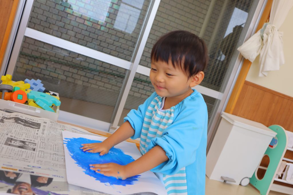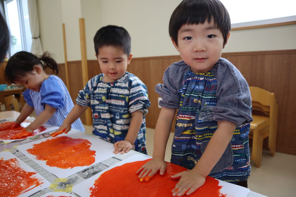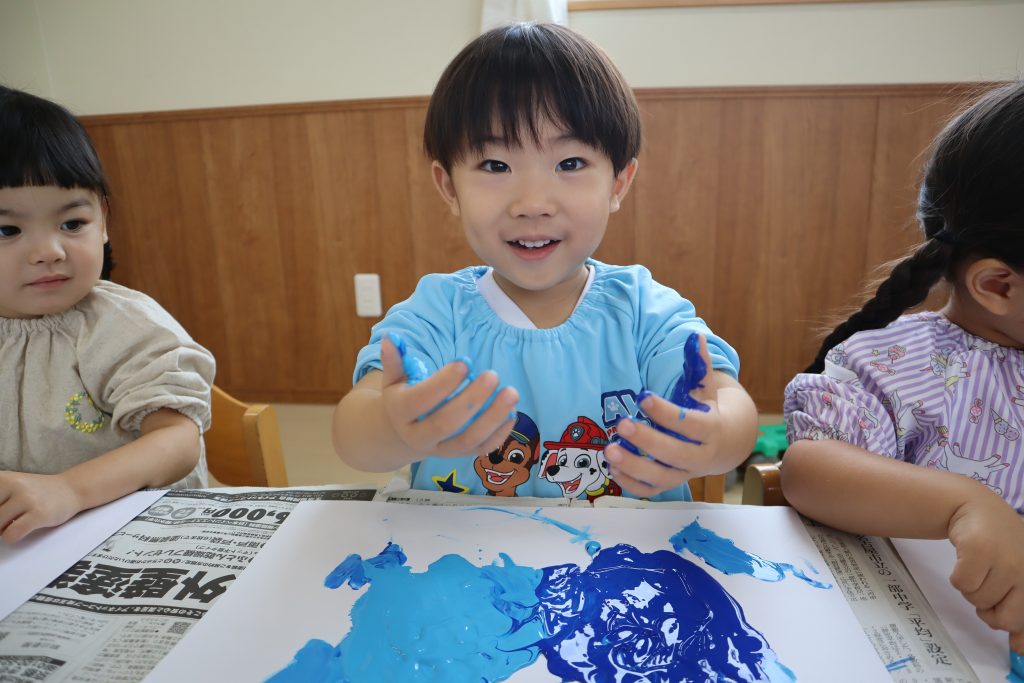 手のひらに絵の具をつけて画用紙いっぱいに広げていきます!