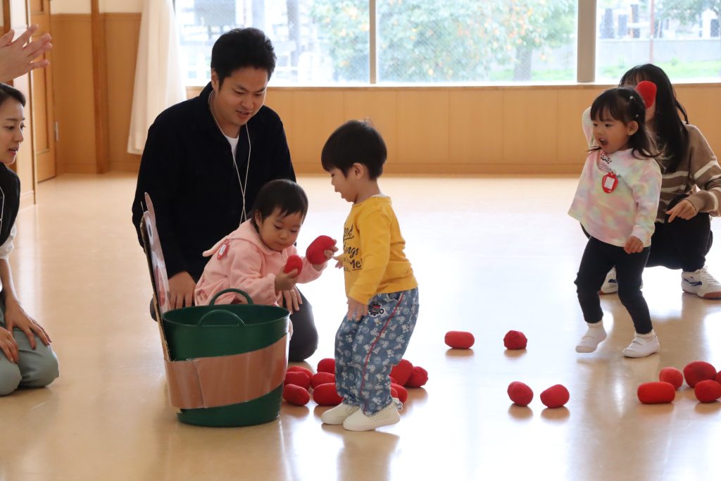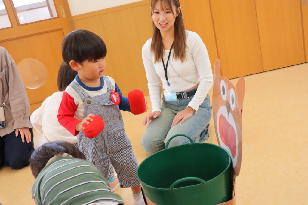 どちらのチームがくまさんのカゴに玉を多く入れられるかな~?🐻