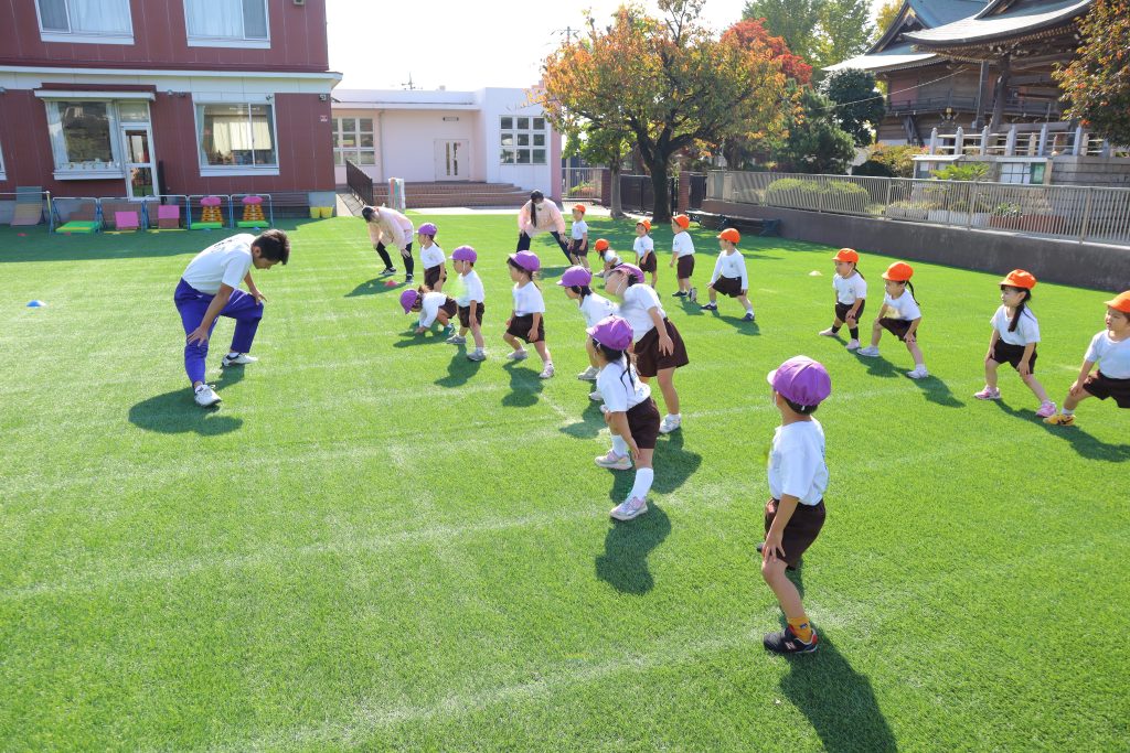 そのあとは、準備運動です。腕を横に広げてお友だちとの間隔を確認しながら、怪我をしないよう入念に体をほぐします💪✨