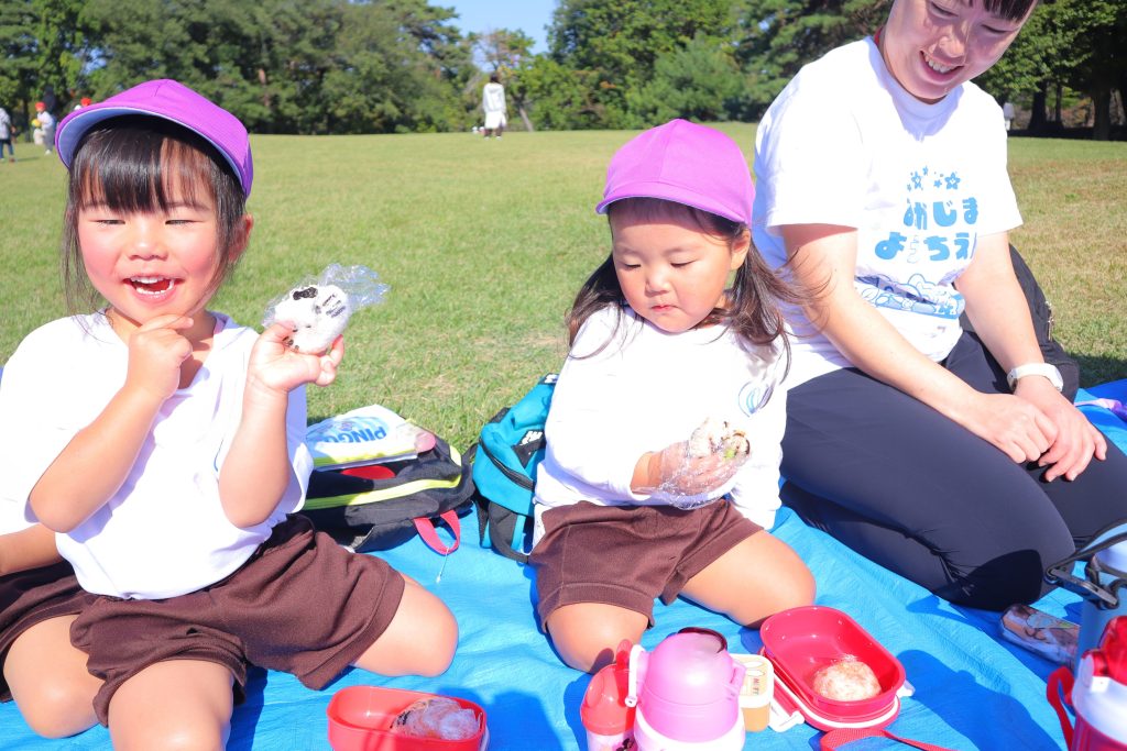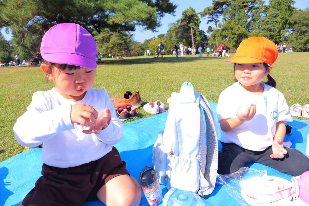 お友だちとおにぎりの具の話をしたり、持ってきたおやつの話をしたりしながら青空の下で楽しくお弁当をいただきました🍙💖