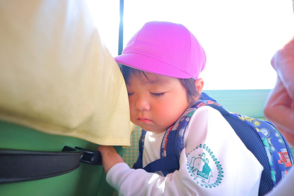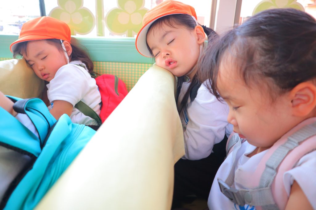 帰りのバスでは、沢山遊んで疲れて眠るお友だち💤