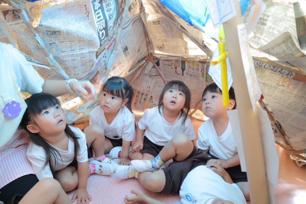 テントを目の前に「わぁ!」と感嘆の声をあげると、中に入って寝転んだり、カラーポリ袋が張られた綺麗な色の天井を眺めたり楽しむ姿が見られました。