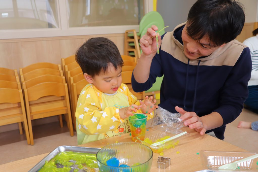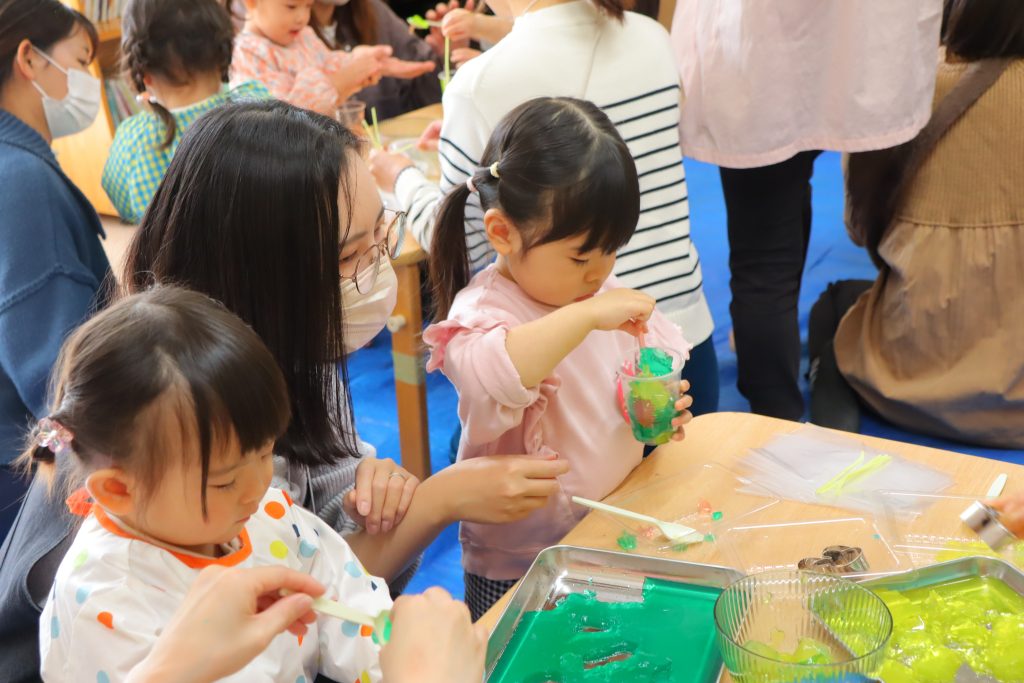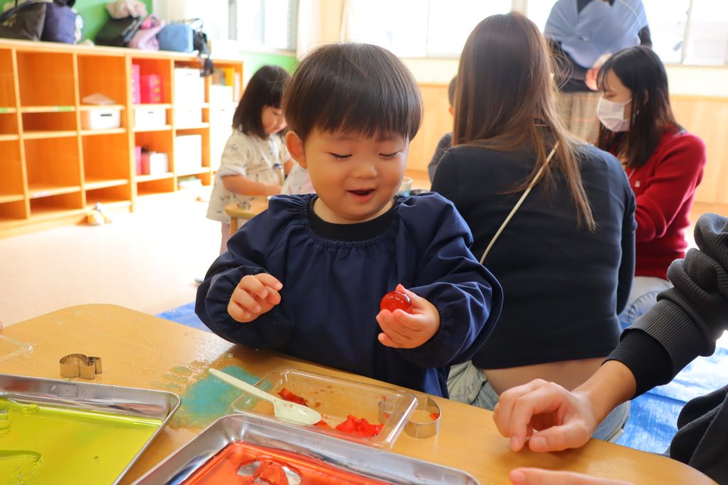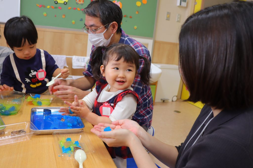 手やスプーン、型抜きを使って寒天の感触を楽しみました!🥄